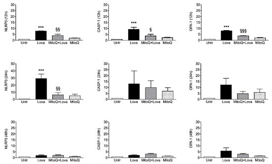 Relative quantification by qPCR of NLRP3, OPA-1 and CASP-1 genes in DAOY cell line (N = 4 independent experiments). DAOY cells were incubated for 12, 24 and 48 h with lovastatin and Mitoq and afterward collected for RNA extraction and quantification. Results are reported as mean ± SD. Statistically significant p-values are shown (Lova vs. Untreated: *** p < 0.001; MitoQ + Lova vs. Lova: § p < 0.05; §§ p < 0.01; §§§ p < 0.001 based on one-way ANOVA, post-test Bonferroni). Abbreviations: Untr, untreated; Lova, lovastatin; NLRP3, NACHT, LRR and PYD domains-containing protein 3; OPA-1, Optic Atrophy 1; CASP-1, caspase 1.