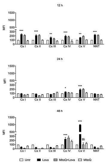 Measurement of the mitochondrial complexes (I–V), 12 h after the treatment with lovastatin, revealed a significant increased activity and these results persist at 24 and 48 h after treatment just on Complexes IV and V (Figure 4). Of note, MitoQ was not able to counteract the lovastatin action, except for Complex V. As shown in Figure 4, after 48 h of treatment with MitoQ and lovastatin, we could evidence a loss of activity of the Complex V compared to lovastatin alone. MitoQ, indeed, in this condition, showed a strong inhibitory effect, and this result indicates a decreased mitochondrial activity during Lova + MitoQ stimulation.
