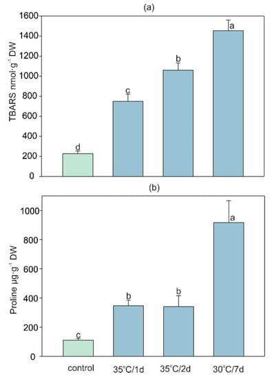 2.2. High-Temperature-Induced Changes in Lipid Peroxidation and the H2O2 and Proline Content