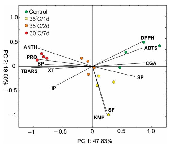 | 35 °C/2 d | 0.62 ± 0.03 b | 7.97 ± 0.54 a | 3.81 ± 0.26 ab | 9.86 ± 0.30 a |