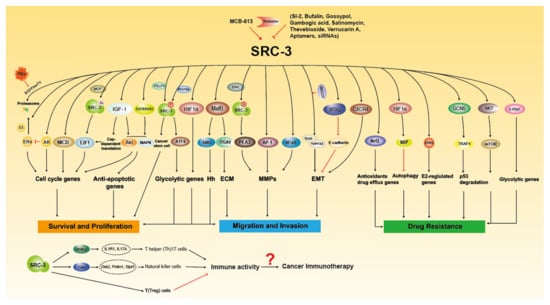 Since the 1970s, tamoxifen has been considered as the first-line hormone therapy for ER-positive breast cancer. However, acquired resistance to tamoxifen has become a great challenge in breast cancer treatment. High levels of SRC-3 are associated with disease-free survival of patients treated with tamoxifen, which is indicative of tamoxifen resistance []. Furthermore, high SRC-3 expression in patients with high levels of HER-2 or other HERs was associated with higher risk of relapse and worse outcome on tamoxifen therapy [,]. Then, it was found that tamoxifen significantly increased SRC-3 expression independent of dose, which was positively correlated with HER-2 expression []. Based on tamoxifen-resistant cells, SRC-3 was found to be required for tamoxifen resistance, and the silence of AIB1 resulted in the restoration of tamoxifen sensitivity []. In addition, tamoxifen-resistant cells showed high levels of acetyltransferase GCN5 due to its reduced proteasomal proteolysis, thereby increasing SRC-3 expression to induce p53 degradation and tamoxifen resistance []. In terms of molecular mechanism, tumor necrosis factor receptor associated-factor 4 (TRAF4), a downstream gene of SRC-3, competed with p53 to interact with deubiquitinase HAUSP, and then induced p53 proteasomal degradation and resistance to cytotoxic agents []. SRC-3 also directly interacts with estrogen-related receptor α (ERRα) and increased endocrine resistance by controlling E2-regulated genes in a hormone-independent manner []. Autophagy plays a dual role in cancer progression, including pro- and antitumor effects []. As a coactivator, SRC-3 was recruited to the promoter of macrophage migration inhibitory factor (MIF) and promoted its expression through interaction with transcriptional factor hypoxia-inducible factor (HIF) α. MIF is a strong inhibitor of autophagic cell death, so the removal of AIB1 induced autophagic cell death and enhanced chemosensitivity by suppression of MIF []. Therefore, SRC-3 is a potential therapeutic target combined with hormone therapy or chemotherapy.