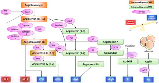 N-acetyl-seryl-aspartyl-lysyl-proline (Ac-SDKP) and the adipokine apelin, other alternative substrates of ACE and ACE2 respectively, also join the cardioprotective arm of the RAS. Ac-SDKP administration exerts an anti-inflammatory, antiproliferation, antidifferentiation and anti-migration effect which in general attenuates cardiac fibrosis and Ac-SDKP augmentation by ACE inhibitors and partially mediates their pharmacological benefits []. Apelin binds to the GPCR APJ, exerting positive inotropic as well as cardioprotective effects [,,].