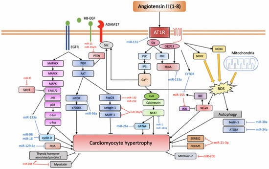AT1R triggers a variety of signalling pathways that can be divided into the canonical pathway depicted at the centre of the figure: the EGFR transactivation pathway depicted to the left and the inflammatory pathway depicted on the right (based on []). Anti-hypertrophic miRNAs are depicted in blue, while pro-hypertrophic ones are depicted in red.