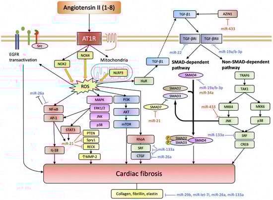 miR-21 shows a close relationship with cardiac fibrosis, and its levels are selectively enhanced in myocardial infarction and heart failure [,]. miR-21 exerts its action by augmenting the MAPK pathways and PI3K/AKT pathways through the direct inhibition of sprouty homolog 1 (Spry1), an inhibitor of the MAPK pathway and phosphatase and tensin homolog (PTEN), an inhibitor of PI3K [,,]. The Ang II-induced activation of Rac1 causes the CTGF- and lysyl oxidase-mediated elevation of miR-21, which in turn inhibits Spry1, leading to enhanced pro-fibrotic MAPK signalling contributing to atrial fibrosis []. What is more, AP-1 and STAT3 activation downstream from the AT1R/NOX/ERK1/2 axis increases miR-21, which directly suppresses PTEN, SMAD7, Spry1, as well as MMP regulator reversion-inducing cysteine-rich protein with Kazal motifs (RECK), leading to increased MMP-2 expression and favouring fibroblast migration, survival, and collagen deposition [,,].