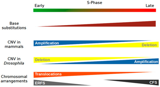 While there is a general consensus about base substitution rates and late replication among different eukaryotes, there are no common rules regarding CNVs and replication timing. A study on iPS cells indicates that amplifications are associated with early-replicating regions, while deletions are associated with later ones [50,51]. Another study investigated the nature and the distribution of these CNVs as a function of RT in 26 cancer lines [52]. Once again, amplifications and deletions were associated with early- and late-replicating regions, respectively. However, the rule is the opposite in Drosophila melanogaster: in other words, losses are associated with early-replicating regions, while amplifications are associated with late-replicating regions [53].
