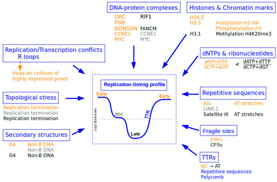 Thus, specific regions of the genome are more sensitive to replication stress than others due to particular genomic or genetic contexts. Importantly, the time of the replication (early, mid, or late) plays a role in this sensitivity. Transcription–replication conflicts and secondary DNA structures seem to be the main sources of replication stress in these fragile genomic regions. Other sources of replication stress can occur during the S-phase and disturb replication dynamics. Potential links between these factors and replication timing are discussed in the next section.