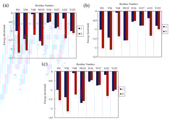 - Hou, T.; Wang, J.; Li, Y.; Wang, W. Assessing the performance of the MM/PBSA and MM/GBSA methods. 1. The accuracy of binding free energy calculations based on molecular dynamics simulations. J. Chem. Inf. Model. 2011, 51, 69–82. [Google Scholar] [CrossRef]