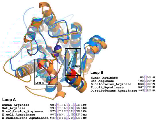 Comparison between agmatinases and arginases. Structural superposition of DrAGM (1WOG) and hARG-I (2AEB). DrAGM and hARG-I are represented in blue and orange, respectively. Loop A and B from DrAGM are shown in cyan, Mn2+ in dark blue, and hexane-1,6-diamino ligand is shown as sticks with blue carbons. Loop A and B from hARG-I are shown in red, Mn2+ ions in yellow, and 2 (S)-amino-6-boronohexanoic acid is shown as sticks with orange carbons. Below each loop has represented the alignment of Loop A and B from agmatinases and arginases.