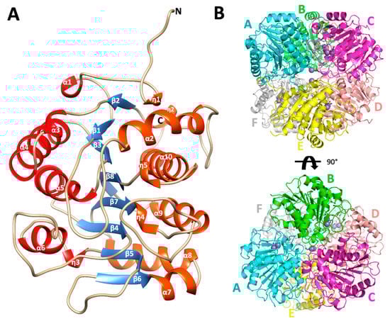Monomer architecture and quaternary structure of Escherichia coli agmatinase. (A) The overall structure of the monomer of EcAGM. The eight central β strands are represented in blue. In red and orange have been represented both sides of helices that connect the β sheet. (B) quaternary structure of EcAGM, each monomer is labeled with letters from A to F. The arrangement of a dimer of trimers (ABC and DEF) in the hexamer is shown.