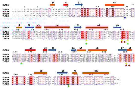 AGMs belong to the ureohydrolases enzymes family, containing all the conserved residues of this family similar to arginases (ARG), proclavaminic acid amidino hydrolases (PAH), guanidinopropionase (GpuA), and guanidinobutyrase (GbuA) [,,]. Arginase and agmatinase catalyze a similar reaction of hydrolysis of a guanidine group, producing urea and ornithine in the case of arginases. Arginases have been extensively studied in various species, being human ARG one of the best-characterized enzymes, kinetically and structurally, in this family. In the Protein Data Bank (PDB) database, there are more than 70 structures of ARG of more than ten different species. Only four x-ray structures have been determined for putative AGMs; Burkholderia thailandensis (PDB 4DZ4), Clostridium difficile (PDB 3LHL), Thermoplasma volcanium (PDB 3PZL), and Deinococcus radiodurans (PDB 1WOG), of which the unique AGM reported with agmatinase activity is DrAGM. However, the study does not report any kinetics parameters or substrate specificity characterization [].