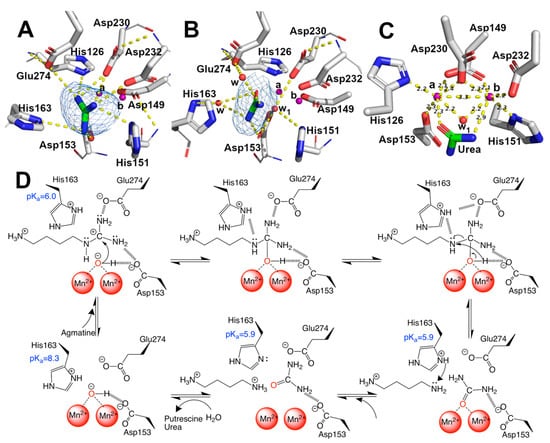 - Salas, M.; Rodríguez, R.; López, N.; Uribe, E.; López, V.; Carvajal, N. Insights into the reaction mechanism of Escherichia coli agmatinase by site-directed mutagenesis and molecular modelling: A critical role for aspartate 153. Eur. J. Biochem. 2002, 269, 5522–5526. [Google Scholar] [CrossRef]