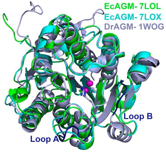 Structural comparison of EcAGM and DrAGM. EcAGM 7LOL and 7LOX are shown as green and cyan cartoons, respectively. DrAGM (PDB 1WOG) is shown as light blue, and its loops A and B are colored in dark blue. Guanidine, urea, and hexane-1,6-diamine are shown as sticks. Mn2+ ions are shown as purple spheres.