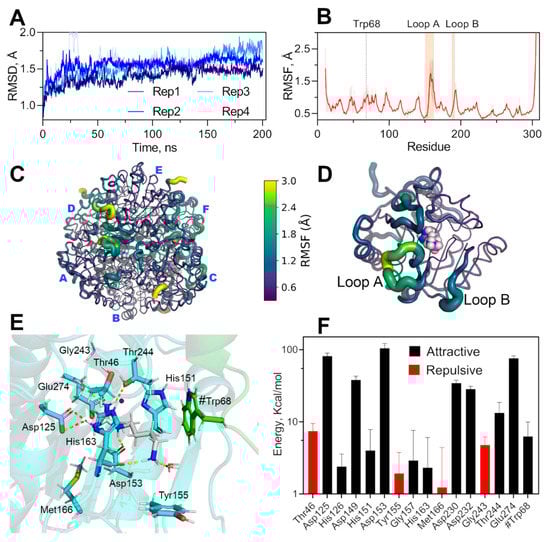 To evaluate agmatine binding mode in the active site of EcAGM, we have docked agmatine taking as reference the position of urea of the EcAGM structure and superimposing the structure of DrAGM (1WOG) with hexane-1,6-diamine, which reconstructs the position and orientation of the agmatine molecule in the active site of EcAGM. In the same way, six agmatine were docked on the EcAGM hexamer, and the system was solvated, neutralized with sodium ions, and energetically minimized using the ff14SB force field in Amber18 (Figure 6). The minimized complex shows that the amino group of agmatine only performs a polar interaction with the carbonyl of His163, in addition to some molecules of solvation water (Figure 6E). Other residues relatively close to the amino group are Thr46 and Ser47 of the β1-α1 loop, but they are located about 6 Å away. Interestingly, the agmatine’s amino group is located in a hydrophobic pocket formed by Tyr155 and Trp68, where Trp68 residue is part of the α2-η2 loop of the neighboring monomer—raising the hypothesis that the agmatine binding site comprises two monomers and that the aromatic residues Tyr155 and Trp68 would interact with the agmatine amino group through a cation-π system.