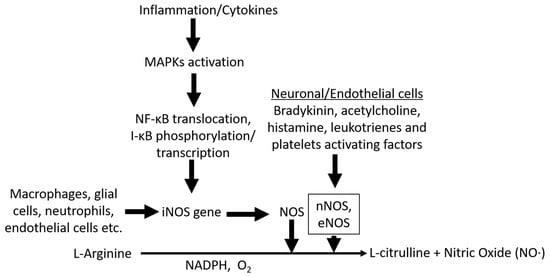 Scheme of nitric oxide (NO) synthesis MAPK activation in myeloid or glial cells can trigger NF-κB transcriptional activation, leading to expression of iNOS. iNOS is subsequently transformed to NOS, which in the presence of NADPH converts L-arginine to L-citrulline and free NO radicals. Stimulants such as bradykinin, acetylcholine, histamine, leukotrienes, and platelet-activating factors from neuronal/endothelial cells or other origins can induce expression of eNOS, and nNOS converts L-arginine to free NO radicals through the same oxidation process.