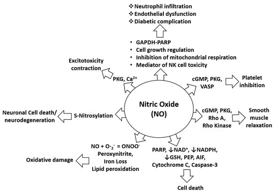 Biological role of NO in pathophysiological conditions. NO-mediated activation of cGMP, PKG, and VASP can cause platelet inhibition while NO-mediated induction of pro-apoptotic proteins such as PARP, AIF, cytochrome C, and cleaved caspase-3 can induce cell death. NO-mediated activation of cGMP, PKG, Rho A, and Rho kinase can alter smooth muscles relaxation. Inhibition of NAD, NADPH, and GSH by NO increases the probability of cell death. Lipid peroxidation caused by NO induces oxidative stress or damage. S-nitrosylation elicited by NO can cause neurotoxicity or neurodegeneration. NO-mediated induction of PKG and calcium signaling causes exitotoxicity and contraction effects. NO is also involved in neutrophil infiltration and endothelial dysfunctions through effects of mitochondrial respiration, through NK cell toxicity, and through activation of the GAPDH-PARP pathway and its functions.