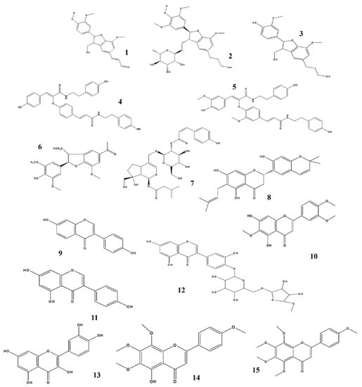 - Kim, K.W.; Quang, T.H.; Ko, W.; Kim, D.C.; Yoon, C.S.; Oh, H.; Kim, Y.C. Anti-neuroinflammatory effects of cudraflavanone A isolated from the chloroform fraction of Cudrania tricuspidata root bark. Pharm. Biol. 2018, 56, 192–200. [Google Scholar] [CrossRef]