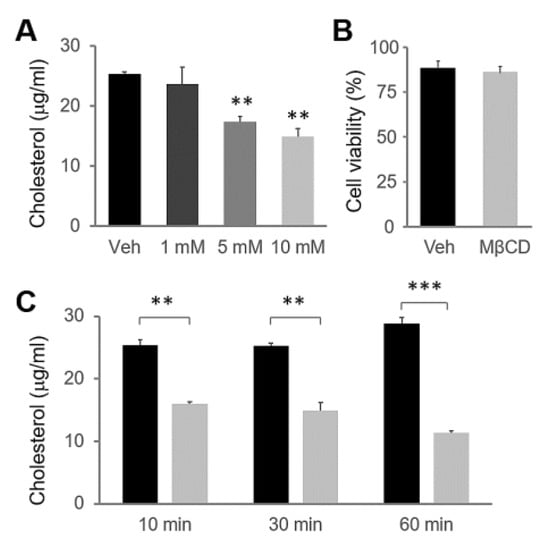 MβCD depletes cholesterol in HSG cells. (A) HSG cells were incubated with the indicated concentration of MβCD for 30 min. (B) HSG cells were incubated with 10 mM MβCD for 30 min and then tested for cell viability using trypan blue assay. (C) The HSG cells were incubated with 10 mM MβCD for the indicated preincubation time. The cholesterol content of cell lysates is depicted as a percentage of the vehicle-treated control (n = 3). ** p < 0.01; *** p < 0.001.