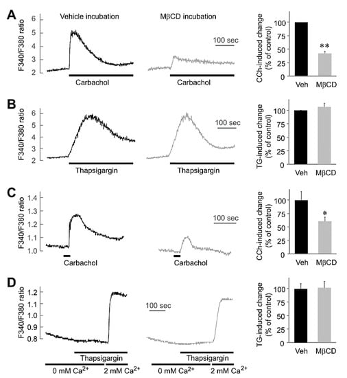 2.2. MβCD Preincubation-Inhibited Muscarinic [Ca2+]i Increases without Any Effect on Thapsigargin-Mediated [Ca2+]i in Salivary Gland Cells