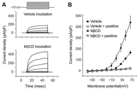 Preincubation with MβCD increases BK channel currents in mouse single SMG cells. (A) Typical current traces obtained in the control cells and those preincubated with 10 mM MβCD for 30 min. Currents were recorded immediately (15–20 s) after achieving whole-cell mode. (B) Average I–V relations of current amplitudes measured at the end of 40 ms pulses to the indicated potentials in the absence (●) or presence (▲) of 10 mM MβCD. Open circle (○) and open triangle (△) plots were obtained after the addition of 1 μM paxilline, a BK channel inhibitor. Each point represents the mean ± SEM (n = 10 or 11). The pulse protocol is shown as the graph insert.