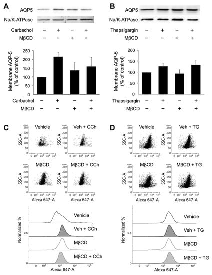 Finally, we examined the effect of lipid raft depletion on AQP5 translocation to the plasma membrane. Interestingly, MβCD inhibited carbachol-induced AQP5 translocation but did not affect thapsigargin-induced AQP5 translocation (Figure 3). Given that MβCD did not cause a thapsigargin-induced Ca2+ increase or an increase in AQP5 translocation, our results indicate that the lipid raft does not affect the translocation of AQP5. It has been reported that lipid rafts are involved in targeting aquaporins [], and the colocalization of the lipid raft markers flotillin and AQP5 is increased during treatment with muscarinic receptor agonists and Ca2+ ionophores []. However, it is unclear how lipid rafts affect these sequential events in membranes (i.e., from muscarinic receptor activation to AQP5 translocation). Our results clearly show that MβCD inhibits carbachol-induced AQP5 translocation, mainly at the receptor level.