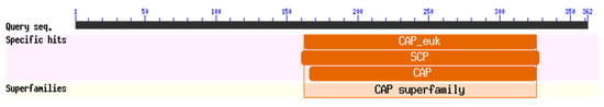 Venom allergen-like proteins (VAPs) that exist widely in animals and plants are members of the cysteine-rich secretory protein (CAP) family, characterized by highly conserved cysteine residues at the carboxyl terminus. Hawdon et al. [] cloned the first animal-derived VAP gene, AcASP1, from the animal-parasitic nematode Ancylostoma caninum. AcASP1 encoded protein was found to be secreted into the host only by infective third-stage larvae, indicating that AcASP1 plays an essential role in host infection by the nematode. Subsequently, this gene was also discovered in another animal-parasitic nematode, Hemonchus contortus, and its encoded protein was localized in the nematode pharyngeal cavity; thus, the protein may be secreted into the host to exert its function [].