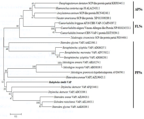 Neighbor-joining tree of RsVAP from Radopholus similis and related proteins from other nematode species. The phylogenetic tree for proteins with conserved domains of cysteine-rich secretory proteins from free-living nematodes, animal-parasitic nematodes, and plant-parasitic nematodes was generated using MEGA 6.0. The deduced amino acid sequence of RsVAP is marked in bold, and each sequence of other nematode species is followed by its accession number in GenBank. The bar indicates a 10% sequence variance.