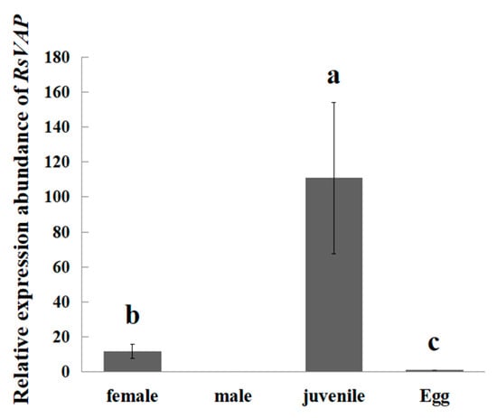 Using RT–qPCR, we analyzed the relative expression levels of RsVAP in different life stages of R. similis. RsVAP expression was detected in females, juveniles, and eggs, but not in males (Figure 4). The expression levels of RsVAP in juveniles were significantly higher than those in the other life stages (p < 0.05), i.e., 9.56- and 108.02-fold compared with females and eggs, respectively. The expression levels of RsVAP were also significantly higher (11.30-fold) in females than in eggs (p < 0.05).
