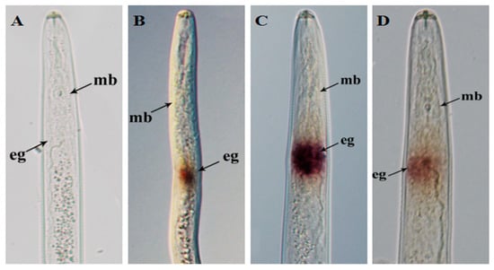 Tissue localization of RsVAP in Radopholus similis via in situ hybridization. (A) No hybridization signals were detected in negative control nematodes with digoxigenin-labeled sense RsVAP RNA probe; (B–D) specific hybridization signals were detected in the esophageal glands of R. similis with digoxigenin-labeled antisense RsVAP RNA probe; mb: medium bulb; eg: esophageal gland.