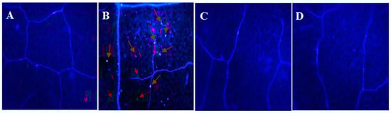 Inhibition of flg22-induced callose deposition in tobacco by RsVAP of Radopholus similis. (A) Blank control; (B) tobacco leaves were soaked in 10 μM flg22 solution 48 h after egfp injection; (C) tobacco leaves were soaked in 10 μM flg22 solution 48 h after RsVAP injection; (D) tobacco leaves were soaked in 10 μM flg22 solution 48 h after RsVAPΔSP injection. Calloses are marked with red arrows.