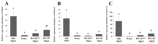 Significant differences were detected in NbPti5 gene expression levels between the RsVAPΔSP+flg22 and egfp+flg22 treatments (p < 0.05), but neither between the RsVAP+flg22 and egfp+flg22 treatments (p > 0.05), nor between the RsVAP+flg22 and RsVAPΔSP+flg22 treatments (p > 0.05). Compared with the water treatment, the relative gene expression levels of NbPti5 in the RsVAP+flg22 and RsVAPΔSP+flg22 treatments were both upregulated with no significant difference (p > 0.05).
