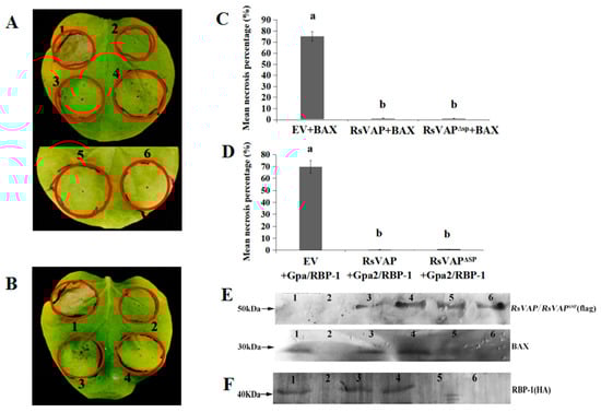 Repression of BAX/Gpa2/RBP-1-induced cell death in tobacco by RsVAP of Radopholus similis. (A) Repressive effect of RsVAP on BAX-induced cell death; (B) repressive effect of RsVAP on Gpa2/RBP-1-induced cell death; (C,D) mean percentage of necrosis lesions in different treatments, and a, b above the bars indicating significant differences (p < 0.05) among groups; (E,F) detection of protein expression by Western blot analysis; diaminobenzidine (DAB) was used for protein staining. (A,E) 1: pCAMBIA1300→24 h→BAX; 2: pCAMBIA1300; 3: RsVAP→24 h→BAX; 4: RsVAPΔSP→24 h→BAX; 5: RsVAP; 6: RsVAPΔSP. (B,F) 1: pCAMBIA1300→24 h→Gpa2/RBP-1; 2: pCAMBIA1300; 3: RsVAP→24 h→ Gpa2/RBP-1; 4: RsVAPΔSP→24 h→Gpa2/RBP-1; 5: RsVAP; 6: RsVAPΔSP.