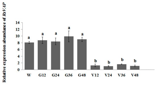 Relative expression levels of RsVAP in Radopholus similis under different RNAi treatments. W: nematodes treated with clean water; G12, G24, G36 and G48: nematodes treated with egfp dsRNA for 12, 24, 36 and 48 h, respectively; V12, V24, V36 and V48: nematodes treated with RsVAP dsRNA for 12, 24, 36 and 48 h, respectively. The y-axis indicates the relative expression level of RsVAP; bars indicate the standard errors of the mean (n = 3), and a, b above the bars indicate significant differences (p < 0.05) among groups.