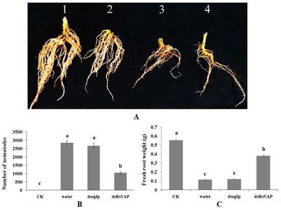 Pathogenicity and reproduction of Radopholus similis on tomatoes after RsVAP RNAi treatment. (A) Tomato root symptoms 30 d post-inoculation with R. similis, 1: healthy roots; 2: roots inoculated with RsVAP-RNAi nematodes; 3: roots inoculated with nematodes soaked in egfp dsRNA; 4: roots inoculated with nematodes soaked in water. (B,C) Number of nematodes and fresh root weight in different treatments, CK: healthy control; water: nematodes soaked by clean water for 24 h; dsegfp: nematodes soaked in egfp dsRNA for 24 h; dsRsvap: nematodes soaked in RsVAP dsRNA for 24 h. Bars indicate the standard errors of the mean (n = 10), and a–c above the bars indicate significant differences (p < 0.05) among groups.