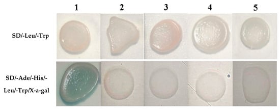 Co-transformation of yeast cells with bait vector and prey vector to verify the interaction between RsVAP of Radopholus similis and candidate tomato proteins. 1: pGBKT7-RsVAP+pGADT7-LeRabA1d; 2: pGBKT7+pGADT7-LeRabA1d; 3: pGBKT7+pGADT7; 4: pGBKT7-RsVAP+pGADT7-LeOCS; 5: pGBKT7+pGADT7-LeOCS.
