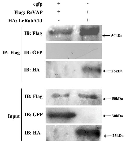 We then performed a Co-IP assay to verify the interaction between RsVAP and LeRabA1d. The results showed that all proteins in the total protein extracted from tobacco were expressed normally. However, only LeRabA1d expression was detected in the IP samples, whereas egfp expression was not detected (Figure 13). These results confirmed that RsVAP interacts with LeRabA1d.