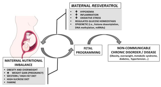 The developmental origins of health and disease theory emphasizes the link between fetal and neonatal exposure to environmental factors and the development of metabolic and other disorders later in life [1,2,3,4,5,6,7,8,9]. This theory indicates that maternal nutrition during sensitive time periods of early development, prior to and during pregnancy and lactation, can strongly impact the offspring’s health later in life. Moreover, increasing evidence has shown that maternal nutritional imbalances, in addition to maternal overweight and obesity, may lead to long-term effects on the metabolic health of the offspring, increasing the risk of common non-communicable disorders and diseases such as obesity, diabetes and cardiovascular disease [10,11,12,13] (Figure 1) and that these effects can even be transmitted to future generations. Likewise, maternal resveratrol intake has also been shown to have effects on both the mother and fetus, with a possible interaction between maternal nutrition and resveratrol intake on the offspring’s long-term health, as depicted in Figure 1. Obesity is a prevalent metabolic disorder worldwide and the fact that the maternal obesogenic environment can lead to cyclical transgenerational transmission could contribute substantially to augmenting the obesity epidemic. Indeed, in 2016 the World Health Organization reported that in Europe 50% of women of childbearing age and 20%–25% of pregnant women were either overweight or obese [14]. Curtailing excessive weight gain during pregnancy has been shown to have health benefits for both the mothers and offspring, emphasizing that it is crucial to target all stages of development in order to reverse the obesity trend [15]. Unfortunately, lifestyle interventions, including diet and exercise, have shown low compliancy and limited efficacy.