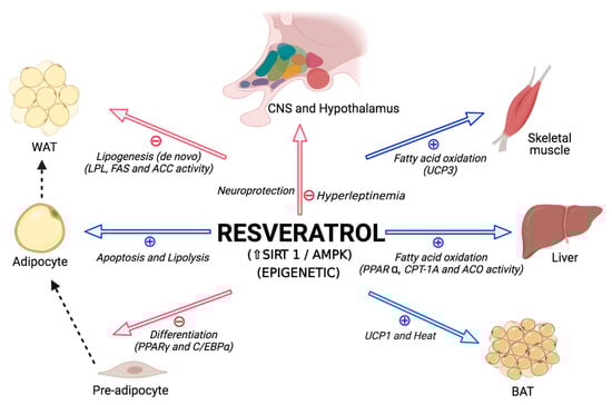 Proposed metabolic effects of resveratrol. ACC: acetyl-CoA carboxylase; ACO: acyl-CoA oxidase; AMPK: AMP-activated protein kinase; BAT: brown adipose tissue; C/EBP: CCAAT/enhancer-binding protein; CNS: central nervous system; CPT: carnitine palmitoyltransferase; FAS: fatty acid synthase; LPL: lipoprotein lipase; PPAR: peroxisome proliferator-activated receptor; SIRT: sirtuin; UCP 1 and 3: uncoupling protein 1 and 3, respectively; WAT: white adipose tissue. The red arrows represent inhibition and the blue arrows stimulation. The dashed black line indicates the direction of tissue changes. Figure modified from Aguirre L. et al. [20]. Created in BioRender.com.