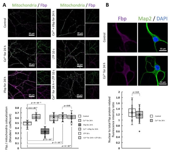 Fbp2 is a moonlighting protein that can be engaged in many cellular processes depending on its subcellular localization [1] which in turn, is regulated by the oligomeric and conformational state of the protein. The dimeric and tetrameric R-state Fbp2 can associate with mitochondria [8,11], whereas only the tetrameric form can be retained in the cell nucleus [8]. To explore if Co2+ influences the subcellular localization of Fbp2 we checked the Fbp-mitochondria colocalization and the nuclear accumulation of the protein after incubation of neuronal cultures with CoCl2 for 24 h (Figure 1a,b).