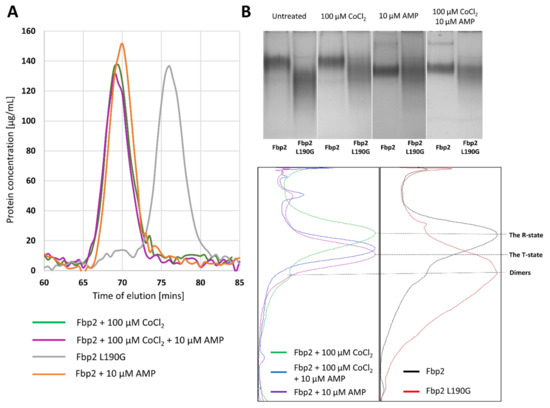 To further clarify the influence of cobalt on the conformation and/or the oligomeric state of Fbp2, we used the size-exclusion chromatography (SEC) and Native-PAGE. The SEC analysis revealed that Co2+ could not induce dissociation of Fbp2 tetramers into dimers (Figure 2a). This was corroborated by results of the Native-PAGE experiments which showed that Co2+ had no effect on Fbp2 mobility and thus, it presumably did not affect the structure of the enzyme. Evidently, in the presence of Co2+ Fbp2 adopted an R-like tetrameric structure (Figure 2b).