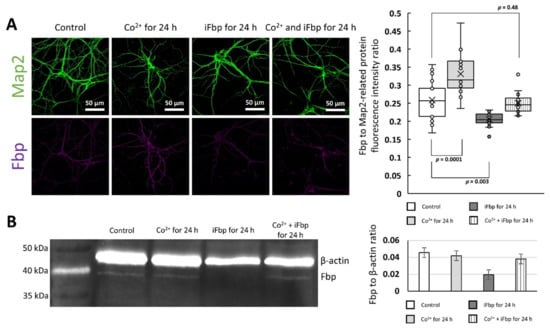 Quantification of Fbp2 protein in Co2+-treated neurons. (A) Fbp-related fluorescent signal in neurons incubated with Co2+ is significantly higher than in control cells, whereas the fluorescence is lower in iFbp-treated cells. The decrease in Fbp fluorescence is not observed in neurons treated simultaneously with iFbp and Co2+. (B) Western blot analysis demonstrates that Fbp2 protein amount does not differ significantly among control neurons, neurons incubated with Co2+, and with Co2+/iFbp mixture. Tetramerization of Fbp2 with iFbp reduces the protein-associated signal in comparison to control neurons.