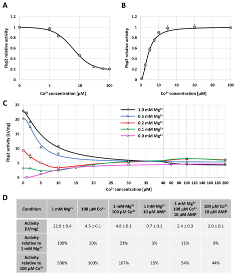 All kinetic experiments were performed at pH 7.5, 37 °C using the glucose-6-phosphate isomerase–glucose-6-phosphate dehydrogenase coupled spectrophotometric assay [44]. The reaction mixture contained: 50 mM HEPES-NaOH, 150 mM KCl, 10 U/mL glucose 6-phosphate dehydrogenase, 10 U/mL glucose 6-phosphate isomerase, 60 µM fructose-1,6-bisphosphate, 0.2 mM NADP+, 1 µg of Fbp2 and variable concentrations of MgCl2 and CoCl2 in the total volume of 1 mL. One unit (U) of enzyme activity is defined as the amount of the enzyme that catalyzes the formation of 1 µmol of product per minute. The kinetic parameters were estimated using GraFit Version 4 software (Erithacus Software Limited, Surrey, UK). The data on the effect of Co2+ were fitted to the following equation: