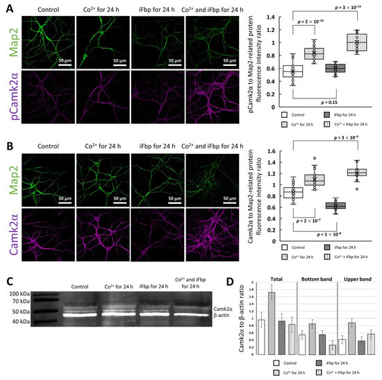 The above results suggested that Co2+ elevated the amount of activated Camk2α and the total kinase level (Figure 5a,b). To verify this we performed WB. As one could expect, the use of anti-Camk2α antibodies resulted in two separate bands on the blotting membrane (Figure 5c). Because phosphorylated forms of proteins migrate slower in SDS-PAGE [41] we attributed the lower Camk2α band to the dephosphorylated and the upper band to the phosphorylated form of the kinase. The densitometric analysis revealed that the incubation of neurons with CoCl2 significantly elevated the total amount of Camk2α in comparison to untreated neurons (Figure 5d). Moreover, Co2+ treatment significantly increased the ratio of the phosphorylated form of the kinase to its dephosphorylated form. Interestingly, the amount of Camk2α remained unchanged after incubation of neurons with iFbp (Figure 5d).