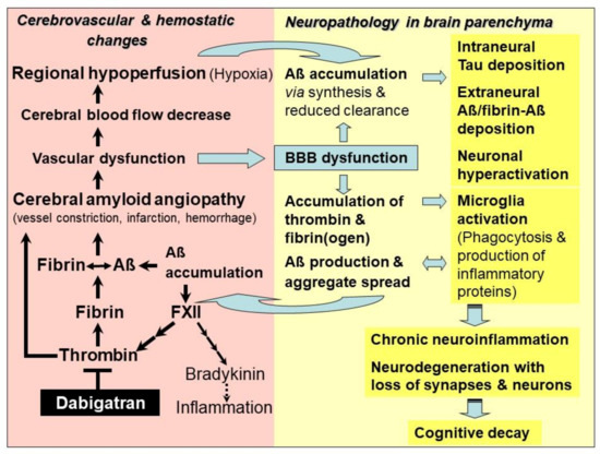 Model of the mechanism of action of the thrombin inhibitor dabigatran for treatment of hemostatic and vascular abnormalities, and derived neurodegenerative changes, contributing to Alzheimer’s disease (AD). As an early and typical event in AD, cerebral blood flow (CBF) decreases and restricts brain perfusion and supply of oxygen (hypoxia) and nutrients, mainly in neocortical and hippocampal areas. Responsible for this hypoperfusion are pathological changes in the cerebrovascular system, which disrupt vascular and blood–brain barrier (BBB) function. This condition is known as cerebral amyloid angiopathy (CAA). In CAA, degradation-resistant fibrin clots containing amyloid-β-proteins (Aβ) are formed (fibrin-Aβ clots) and deposit in and around the walls of blood vessels, causing microvascular constriction, infarction, and hemorrhages. Risk of vessel occlusion is additionally promoted by thrombin-induced platelet aggregation. Aβ intensify this process by activating the blood coagulation factor XII that stimulates the production of inflammatory thrombin and thrombin-mediated formation of fibrin and fibrin-Aβ clots, as well as the synthesis of proinflammatory bradykinin. CAA-induced hypoperfusion (ischemia) and hypoxia up-regulate β- and γ-secretase activities for amplified production of Aβ, oligomers and plaques in nervous system parenchyma. Parenchymal Aβ accumulation is additionally increased by reduced perivascular Aβ clearance, caused by BBB dysfunction. Leakage of BBB also allows plasma proteins, such as thrombin and fibrin(ogen), to pass from the blood vessels into the brain parenchyma, where they accumulate. Thrombin, fibrin and Aβ activate phagocytic microglia cells for production of inflammatory proteins, which further stimulate Aβ production, aggregation and cerebral spread. Fibrin(ogen) interacts with Aβ and promotes fibrin-Aβ clot deposition between neurons. Aβ induce neuronal hyperactivation and synaptic dysfunction, and tau protein-seeded neurotoxic pathologies. Ultimately, this downward spiral of steadily deteriorating vascular and parenchymal changes triggers chronic neuroinflammation, loss of synapses and neurons, and cognitive decay. Dabigatran intervenes at a central point of AD-associated vasculopathies. The drug inactivates free and fibrin-bound thrombin, thus preventing accumulation of inflammatory thrombin, fibrin and fibrin-Aβ clot deposition in cerebral vessels and parenchymal tissue. Consequently, dabigatran could preserve vascular and BBB function, CBF and brain perfusion delivering oxygen and nutrients. Therefore, in brain parenchyma, thrombin-, fibrin- and Aβ-triggered inflammatory milieu and neurodegenerative and cognitive changes could be mitigated or prevented, provided that dabigatran treatment starts immediately after early diagnosis of CAA and AD.