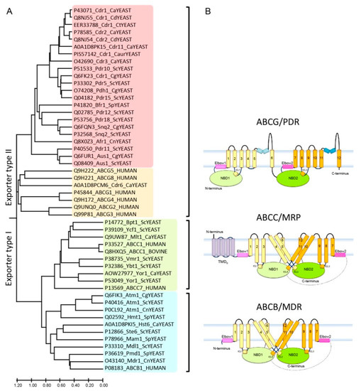 Diversity of fungal PDR transporters and evolutionary relationships to mammalian ABC transporters. Most ABC proteins from non-pathogenic baker’s yeasts (Table 1) are also found in various numbers and functions in pathogenic fungi (Table 2). A phylogenetic tree analysis suggests two major groups, referred to as exporter type I and type II [4,248,265,266], contain three MDR, MRP and PDR subfamilies (Figure 1A). While type I exporters (MDR/ABCB and MRP/ABCC) hold a TMD1–NBD1–TMD2–NBD2 configuration, all PDR/ABCG type II exporters adopt a “reverse” architecture, such as NBD1–TMD1–NBD2–TMD2 (Figure 1B). By contrast with the mammalian ABCG subfamily, all fungal PDR proteins are full-size transporters (Figure 1B).