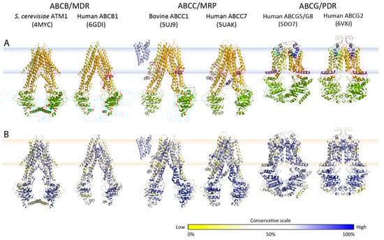 Atomic structures, folds and evolutionary conservation of MDR exporters. (A) Crystal or cryo-EM particle structures of multidrug resistance-related ABC exporters from the type I (ABCB and ABCC) and type II families (ABCG subfamily) using the color codes as shown in Figure 1B. (B) Conservation analysis of ABC exporters from panel A. Multiple sequence alignments of amino acid sequences from Table 1 and Table 2 were generated for all subfamilies. The degree of conservation was calculated and indicated as a color gradient ranging from low conservation (yellow) to high conservation (blue).
