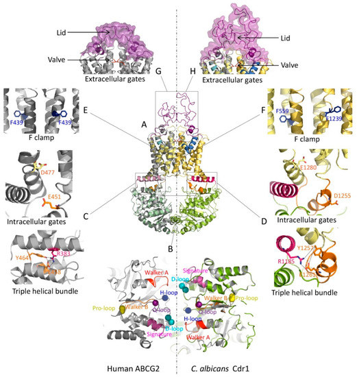 The atomic structures from X-ray crystallography and cryo-EM of mammalian ABCGs suggest a rather unique fold resembling an importer rather than an exporter [38,256,257,258,259]. Indeed, mammalian ABCGs and fungal PDR exporters share conserved and superimposable topologies with all functional motifs in equivalent places (Figure 1A, Figure 2B, Supplementary Figure S1 and Table 4). Hence, we generated homology models of Cdr1 from C. albicans, using human ABCG2 (PDB ID 6VXF) as a template (Figure 3A). Remarkably, the Cdr1 structural model perfectly mirrored the human ABCG2 conformation, since each pivotal motif important for function is also present in Cdr1 (Figure 3).