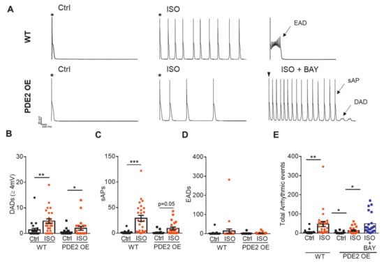Mice with cardiac-specific PDE2 overexpression (PDE2 OE) displayed significantly fewer arrhythmic events upon β-adrenergic stress triggered by isoprenaline (ISO) injections, as well as after myocardial infarction via left anterior descending coronary artery (LAD) ligation []. In order to study the potential antiarrhythmic effect of PDE2 overexpression at the cellular level, we quantified early and delayed afterdepolarizations (EAD, DAD) and spontaneous action potentials (sAP) in isolated cardiomyocytes from PDE2 OE mice and respective wildtype (WT) littermates. Figure 1A depicts representative action potential (AP) recordings in WT and PDE2 OE at basal conditions (Ctrl) and upon isoprenaline application (ISO, 100 nM, 10 min) at 0.125 Hz after stimulating the cardiomyocyte at 4 Hz. Under physiological conditions, the number of occurred DADs, EADs, and sAPs did not differ between WT and PDE2 OE cells (Figure 1B-D). β-adrenoceptor stimulation with ISO significantly increased the number of DADs and sAPs in WT, but not in PDE2 OE (Figure 1B,C). The number of EADs also tended to be higher in WT than OE (Figure 1D). The total number of arrhythmogenic events upon ISO was significantly lower in cardiomyocytes from PDE2 OE compared to WT (Figure 1E). Specific inhibition of PDE2 with BAY 60-7550 (BAY, 100 nM) increased ISO-induced arrhythmogenic events in PDE2 OE cells to the level of WT (Figure 1E). Thus, the antiarrhythmic effect of PDE2 overexpression under β-adrenergic stimulation was also observed at cardiomyocyte level.