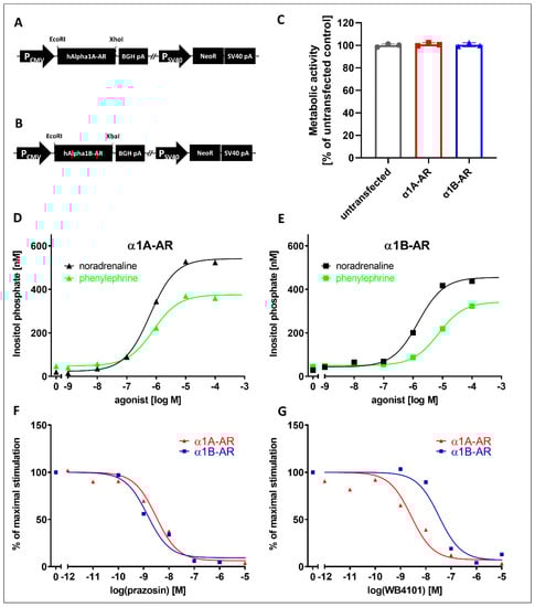 The creation and functional characterization of cell lines stably expressing the α1A- and α1B-adrenergic receptor subtypes in PC12 cells. Expression cassettes of pcDNA3.1+ plasmids used to express human (A) α1A- and (B) α1B- adrenergic receptors. (C) Metabolic activity of untransfected and receptor-expressing lines. Second messenger response of (D) α1A- and (E) α1B-adrenergic receptor-expressing cells to stimulation with the agonists noradrenaline (black) and phenylephrine (green). Second messenger response to a submaximal (EC90) noradrenaline concentration in the presence of the antagonists (F) prazosin and (G) WB4101. PCMV—CMV promoter; hAlpha1A/B-AR—human α1A- and α1B-adrenergic receptors; PSV40—SV40 promoter; NeoR—neomycin resistance gene; BGH pA—bovine growth hormone polyA; SV40 pA—SV40 polyadenylation site. Data are shown as the mean ± SEM, n = 2–4 wells.