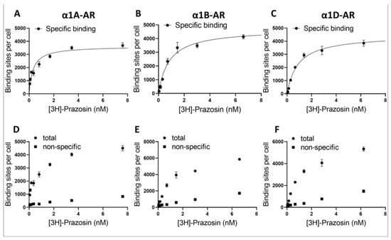 To determine the number of α1-AR binding sites on the cell surface, saturation binding studies were performed with the labeled α1-AR antagonist [3H]prazosin, and in parallel, nonspecific binding was determined in the presence of a non-labeled prazosin (Figure 2).