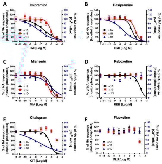 Inositol phosphate generation was measured as an index of α1A- or α1B-AR reactivity with the use of a TR-FRET-based assay, while in the case of α1D-AR cells, the influx of calcium ions was determined with Fluo-4 dye. To measure the modulatory effects of drugs on the noradrenaline-mediated activation of each of the α1-AR subtypes, cells were pretreated for 10 min with various concentrations of antidepressants before the addition of noradrenaline at a concentration eliciting a submaximal (~EC90) receptor response (4 μM for α1A- or α1B-AR and 1 μM for α1D-AR). Then, after 75 or 95 min of incubation (for inositol phosphate or calcium ions measurements, respectively), the levels of second messengers generated were subsequently evaluated. We found that imipramine (Figure 3A), desipramine (Figure 3B), and mianserin (Figure 1C) attenuated the noradrenaline-induced activation of all three α1-AR subtypes, albeit with different potencies (Table 1).